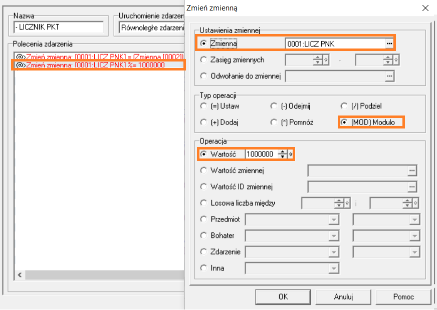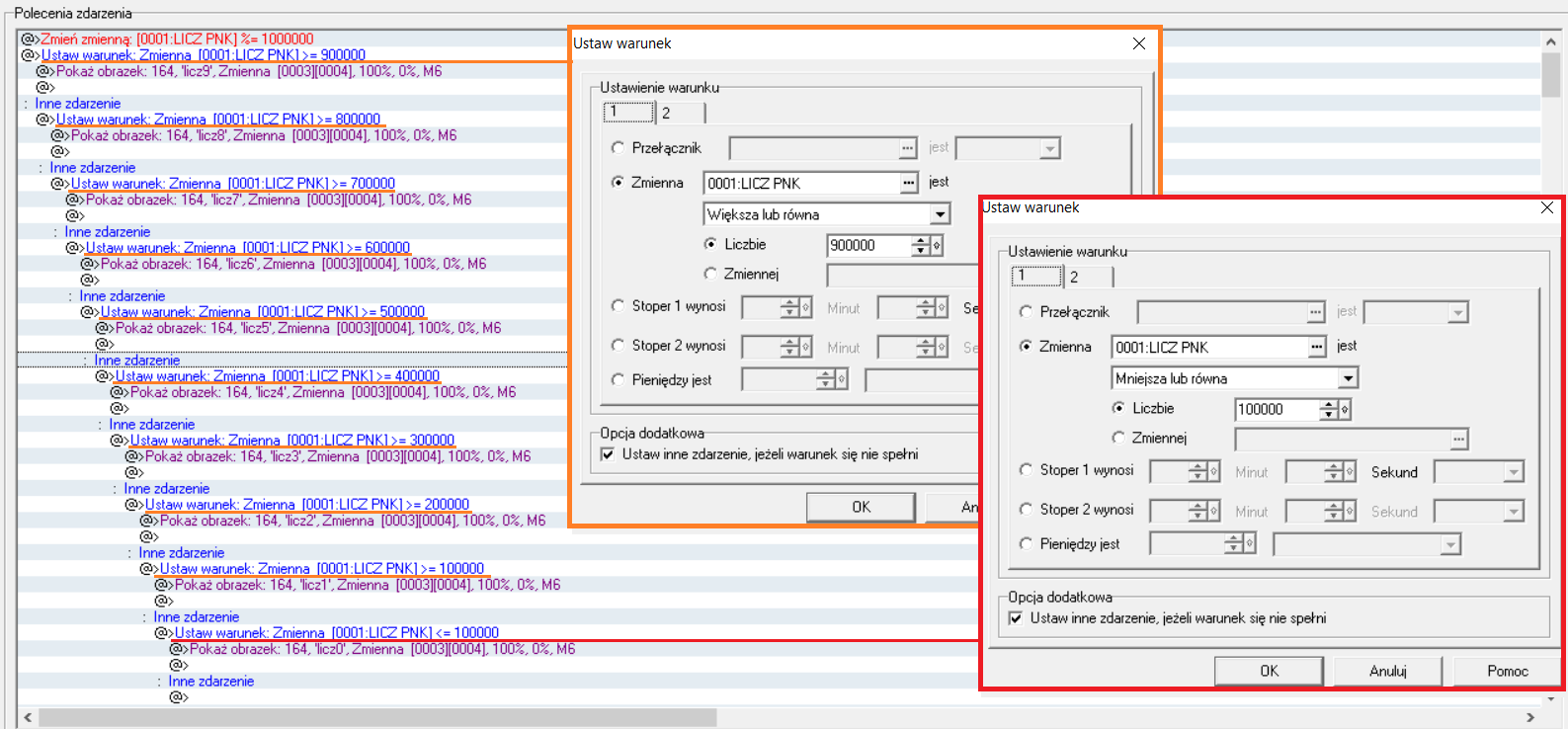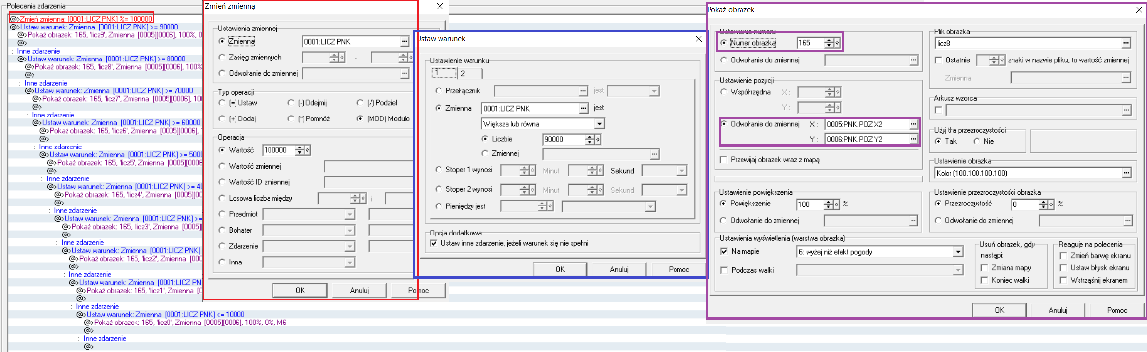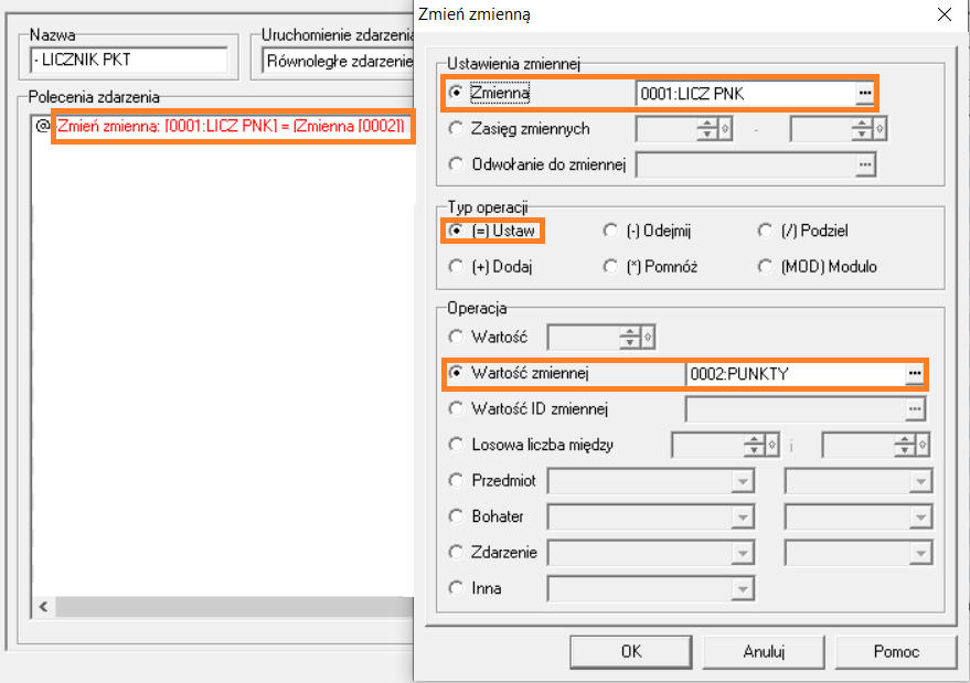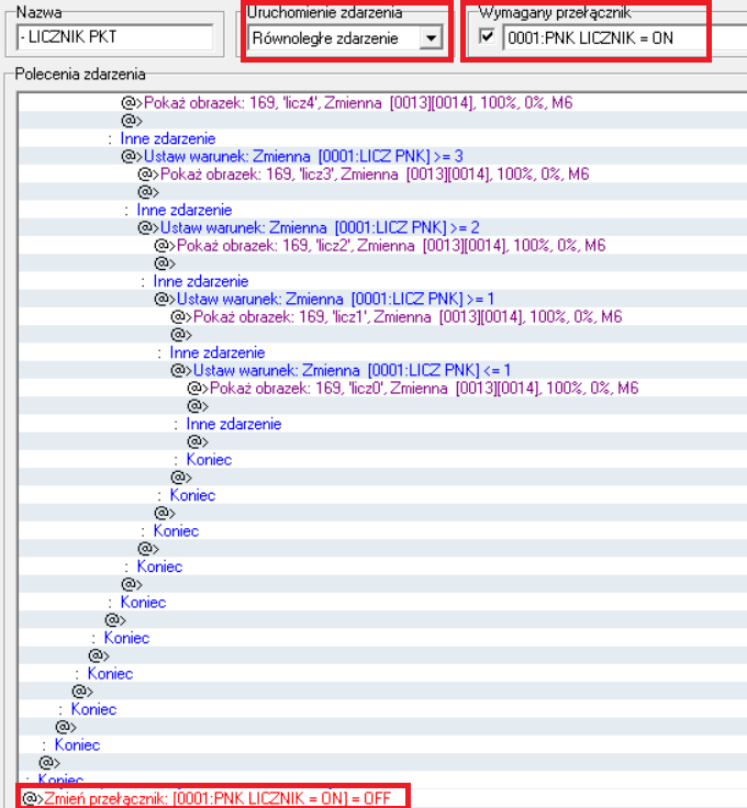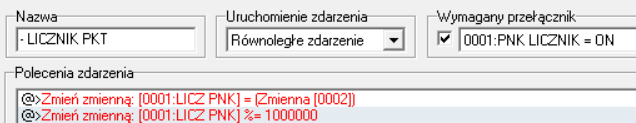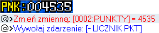 Ustawiamy dalej kolejno to samo co wcześniej, czyli Zmienną 0001: LiczPNK (która jest równa Zmiennej 0002: Punkty)