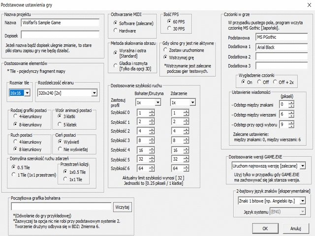 Maksymalna rozdzielczość ekranu WOLF RPG Editor wynosi teraz 1280x720 pikseli (16: 9). A oddzielne rozmiary kafelków to 16x16, 32x32 i 40x40.