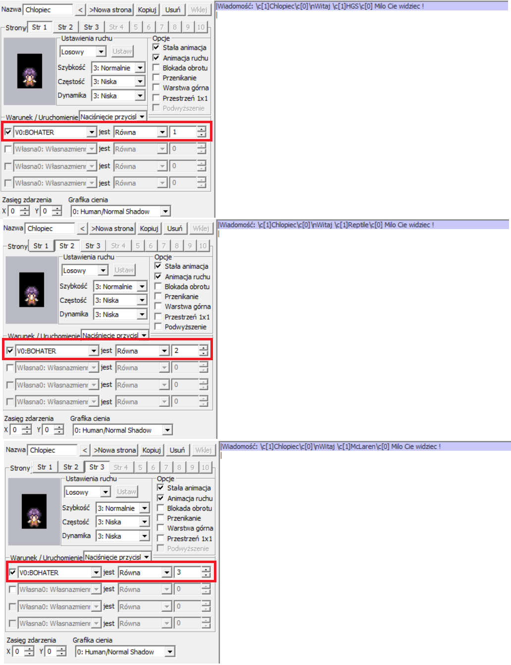 Możemy takie działania, zrobić na dwa sposoby, za pomocą Warunków, lub za Pomocą Stron w Zdarzeniu (wykorzystującą zmienną)