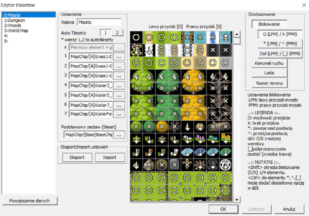 Dzięki Edytorowi zestawu kafelków możesz importować dowolną liczbę kafelków mapy. Możesz ustawić, czy chip mapy jest zgodny z kierunkiem, przypisać id,