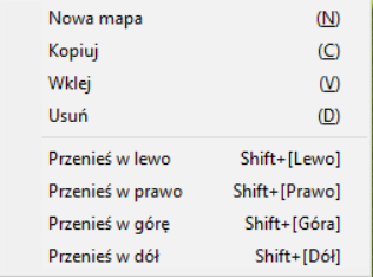 Dodatkowo można również używać skrótów klawiszowych, które sa przypisane do powyższych funkcji: (N), (C), (V), (D), [Shift] + [Strzałka w Lewo] , [Shift] + [Strzałka w Prawo] , [Shift] + [Strzałka w Górę] , [Shift] + [Dół]