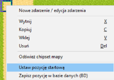 Aby utworzyć pozycję startową bohatera, należy wcisnąć w obszarze mapy na warstwie zdarzeń (4) - kliknąć