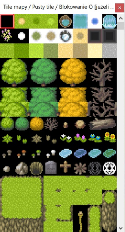 Od lewej do prawej: ustawienia zestawu tilesetów, ustawienia mapy, ustawienia typowych zdarzeń, wybór mapy